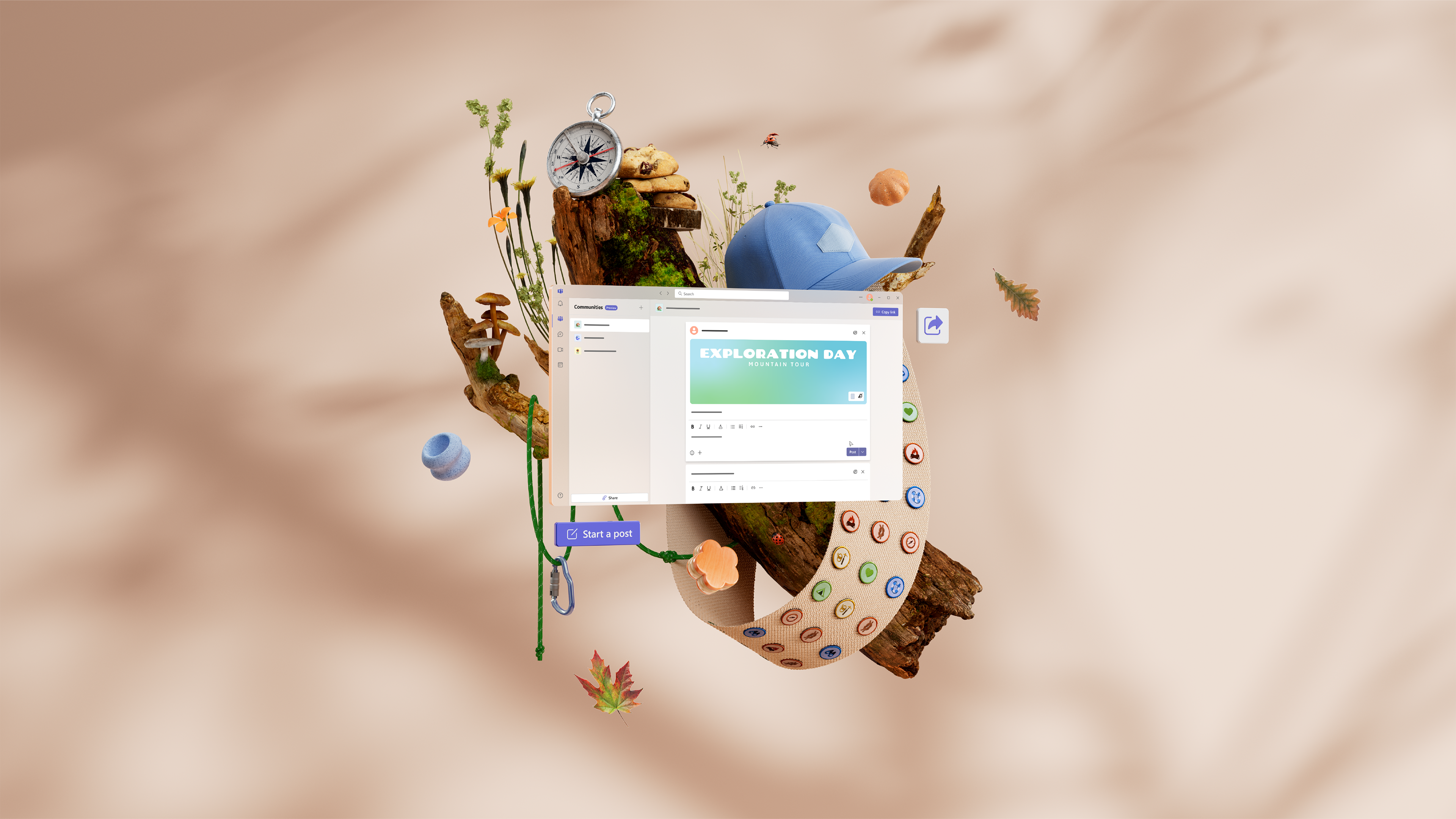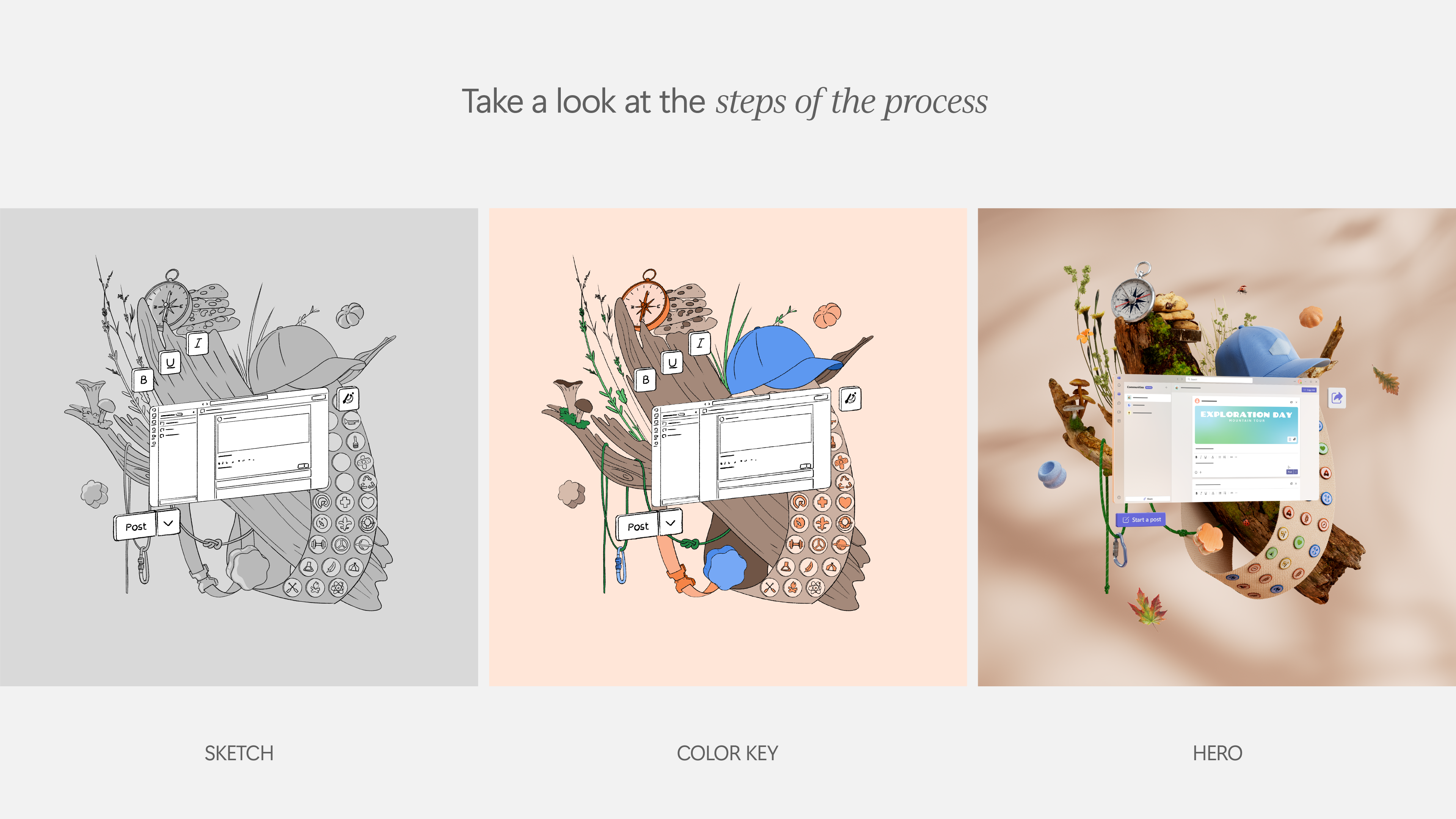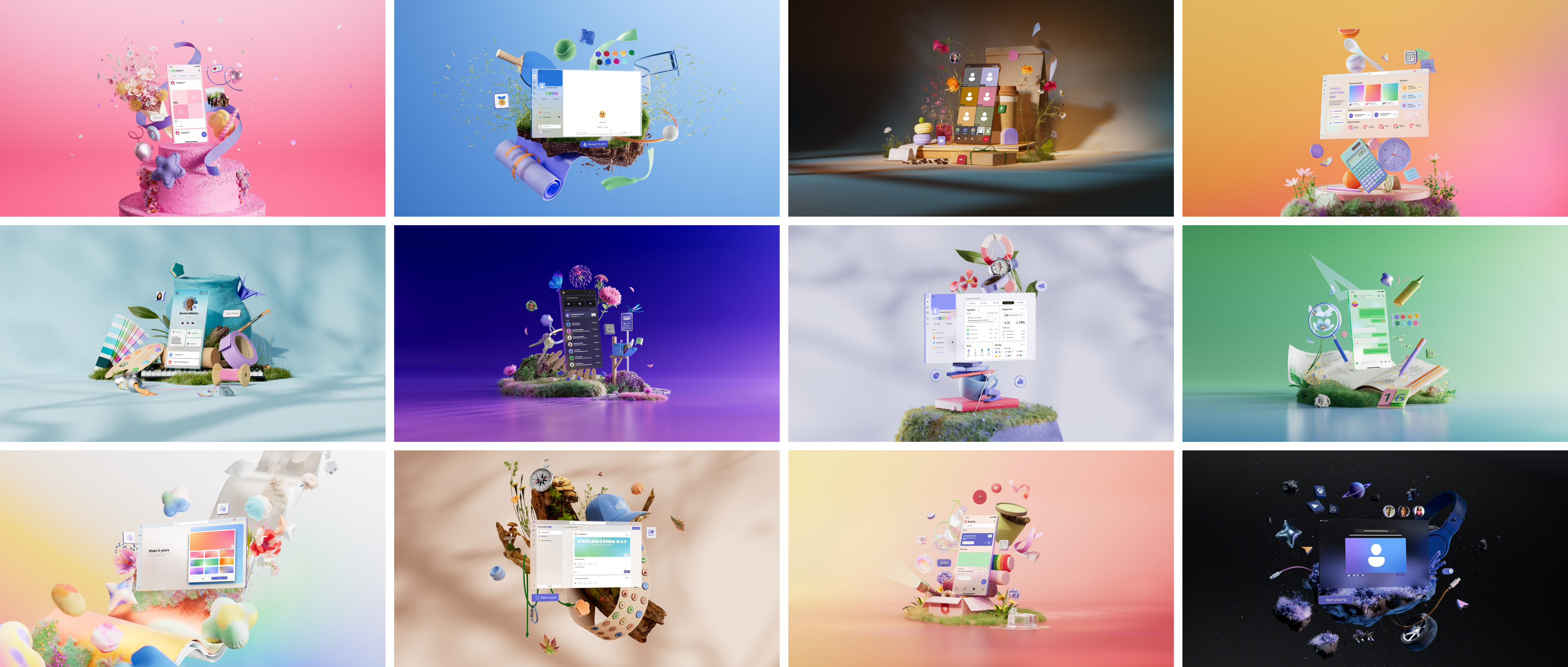 Each hero image is designed to treat the user interface as a product—placing it within relatable, natural environments and surrounding it with carefully chosen elements. These visual elements are meant to evoke belonging and shared identity, reinforcing the idea that Teams is more than a productivity tool: it’s a hub where collaboration, unity, and team spirit come to life.